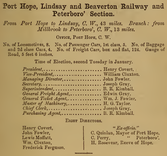 formerly: 1) The Port Hope and Peterborough Railway(1846-1854) 2) The Port Hope, Lindsay, and Beaverton Railway(1854-1869)