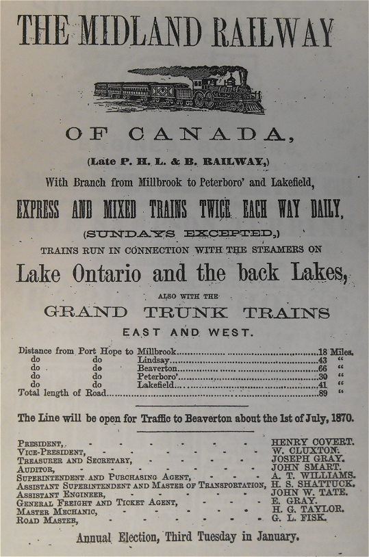 The Port Hope, Lindsay and Beaverton Railway would change it's name again in 1869, and become "The Midland Railway of Canada".