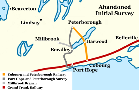 "Some unnecessary sneers indulged in by the people of Peterborough caused the projectors of the road to transfer their line to Lindsay" said Francis Beamish, a director of the company at the time and future Mayor of Port Hope. With the Cobourg railway already servicing the town, the citizens of Peterborough declined to make a financial commitment to the initial Port Hope railway scheme, resulting in the re-routing of the line to Lindsay, Ontario, and the subsequent change in name of the company to "The Port Hope, Lindsay and Beaverton Railway".