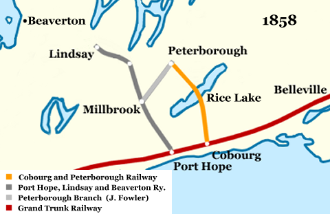 The line was complete to Lindsay in Dec, 1857, and in 1858 a branch was constructed to Peterborough by the railway contractor John Fowler. He and partner George Tate of Toronto, who operated the mainline to Lindsay as well, had a lease to run the Peterborough trains on the mainline between Millbrook and Port Hope. With the only gradient of consequence (ascending against the traffic) being on the mainline south of Millbrook, and then all downhill to the harbour, the branchline was a more cost effective road to operate than the rival Cobourg and Peterborough Railway which was burdened with higher operating costs due to long gradients and constant repairs and improvements to the Rice Lake bridge/causeway. Given the conditions of the lease, the new branchline, or Port Hope and Peterborough Railway as it was called, was in relatively good financial condition.