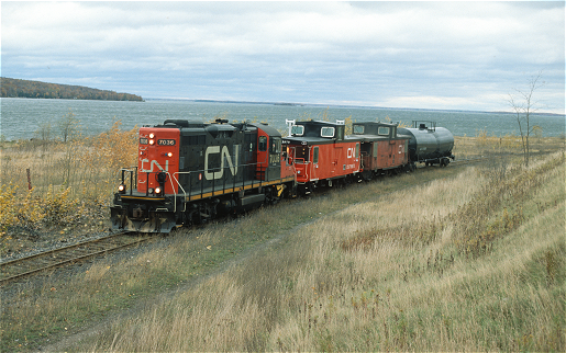 My own connection with the line came about just prior to closing of operations to the town of Midland in 1994. At the time, between 1992-1995, I was photographing many of the rail lines in Ontario and, residing a few blocks from the old right-of-way, was able to acquire dozens of pics of the last trains along the Midland Division of the Canadian National. One or two may have sufficed, however, as just prior to the abandonment the Midland turn often had the same engine, one or two cars, and a caboose. The rail structure was well worn and a speed limit was imposed beyond the quarry at Uthoff, northwest of Orillia. I have a few nails that I dislodged from the ties at Tiffin that dated them to the 1930s and 40s. Much of the ballast there was Sudbury slag. I believe the line from Orillia to the quarry was 115lb ribbon rail, as was the section on the old Northern(CN Newmarket) between Orillia and Barrie where the locomotives were stationed.