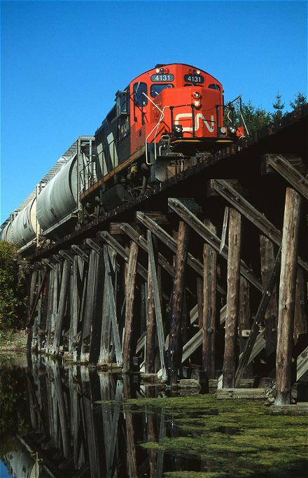 Today the original line between Port Hope and Midland is completely abandoned as a railway. There is however a stretch of the Nipissing section between Uxbridge and Stoufville that is currently being operated as tourist railway. Otherwise, the majority of the old line is now preserved as part of the rail-trail network in the province. The portion between Waubaushene and the Wye River is an excellent paved trail along the original course of the roadbed. Beyond that the route strays a little from its original path as it makes it way through the new development at Tiffin and then along the Midland bayshore, once lined with saw and shingle mills and later a massive shipyard and coal dock. Severn Township has recently purchased the right-of-way between Waubaushene and Coldwater and has made a decent trail with a crushed stone surface. You can park in Coldwater and walk/ride a few hundred meters down the old Medonte Tramway to begin the journey to Waubaushene. East of Coldwater the trail transfers to the old Canadian Pacific right-of-way all the way to Orillia. Although no trail exist east of Orillia, there is a surviving piece of the right-of-way now in use by the Canadian National just north of Beaverton and to the south of the Talbot river. Going north the track crosses from the old Canadaian Northern right-of-way to the old Midland right-of-way for a scenic 500 meters or so along lake Simcoe before crossing the Trent-Severn canal and returning to the old Canadian Northern roadbed at Gamebridge. The section on the Midland leading up to the Talbot river and beyond the Trent-Severn was, however, elevated in 1911 when the Canadian Northern and the Trent Canal were built - making that section non-original as far as elevation is concerned. Beyond Beaverton, heading further east and not quite all the way to Lindsay, is now occupied by a powerline right-of-way, and thus very easy to follow through the farmlands. Inside the town of Lindsay you can walk the original line along the Scugog River from the lock down to the bridge that was built as part of the East Ward bypass in 1883. From east of Lindsay you can pick up the rail trail through to Omemee, and then onto the "Missing Link" section into Peterborough. The scenic Lakefield Rail Trail starts at Trent University north of Peterborough and heads north along the Otanabee river to Lakefield. You can even travel a short section of the Cobourg/Chemong and Peterborough from Rotary Park down through the old station grounds in Ashburnham. Portions of the lines that merged with the Midland have sections of the roadbed converted to trails as well. Most of the Grand Junction is now a trail, and the Uxbridge Rail Trail on the Nipissing line runs north from the town across a restored wooden trestle bridge originally built in 1872. I also remember travelling up the Haliburton Rail Trail between Kinmount and Haliburton many years ago.